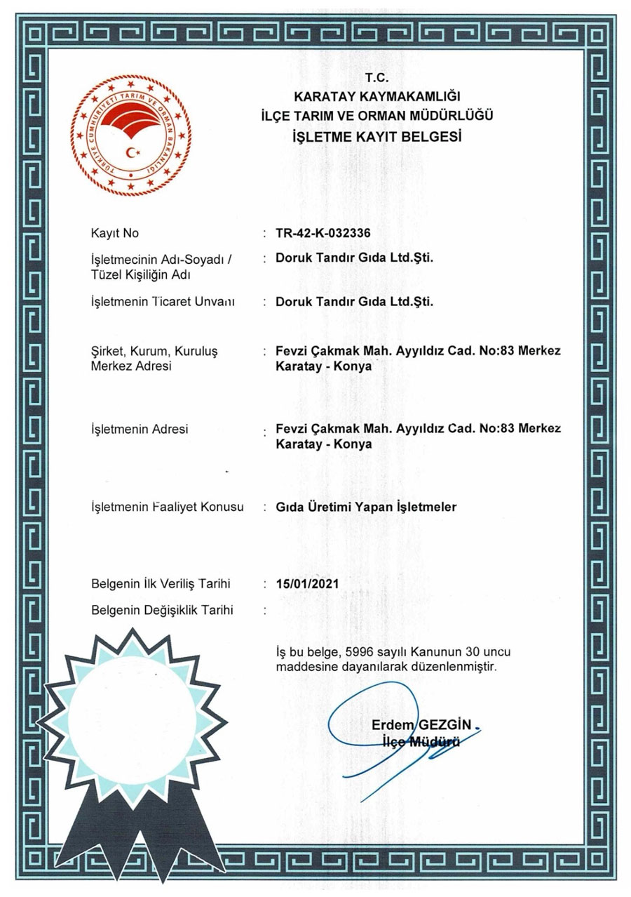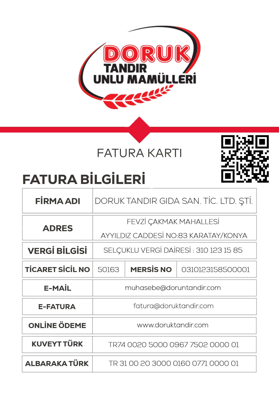 Doruk Tandır Unlu Mamüller, tandır ekmeği, tiritlik tandır ekmeği, tandır düğün ekmeği, tandır gevreği, tandır böreği, muhacir ekmeği, el yapımı bazlama, galeta unu ürünlerinin üreticisi, satıcısı ve imalatçısıdır.